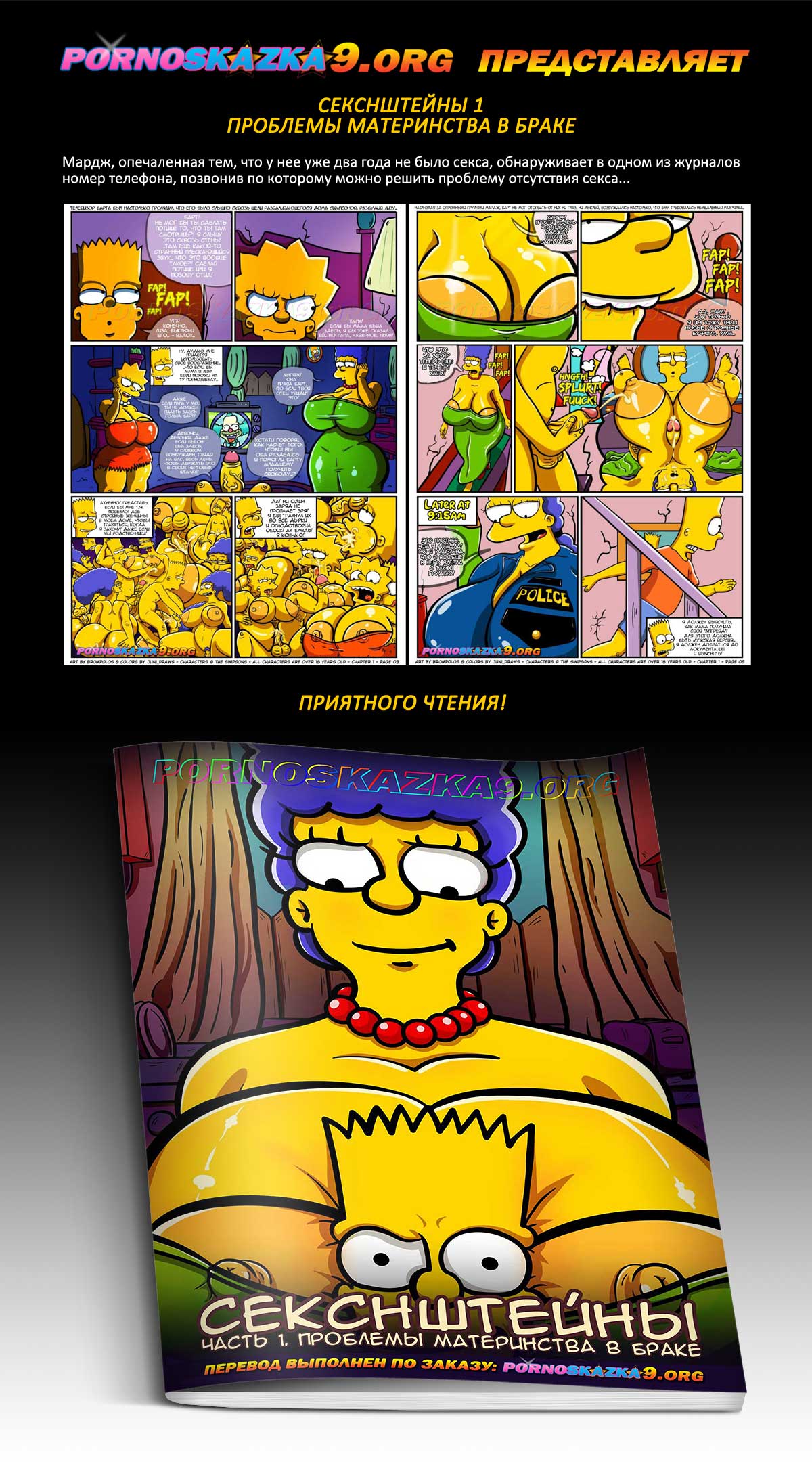 Порно комикс «Секснштейны. Часть 1. Проблемы материнства в браке.» Мардж, опечаленная тем, что у нее уже два года не было секса, обнаруживает в одном из журналов номер телефона, позвонив по которому можно решить проблему отсутствия секса…
